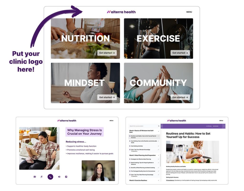 Alterra Health’s 360° lifestyle platform is a plug-and-play solution that integrates seamlessly into existing practice workflows with zero hassle. The platform can be branded with your clinic logo for a seamless patient experience. It’s everything providers wish they had time to provide, now in one simple platform designed to complement clinical care.