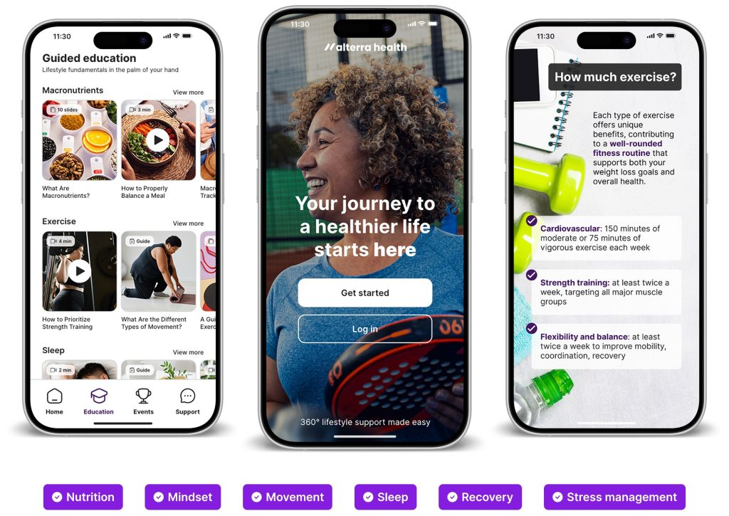 Alterra Health is the leading provider of 360° lifestyle and wellness support with evidence-based, clinically-backed resources trusted by over 650 medical providers. Their comprehensive platform supports all aspects of patient lifestyle care outside of the clinic – nutrition, mindset, movement, sleep, recovery, and stress management.